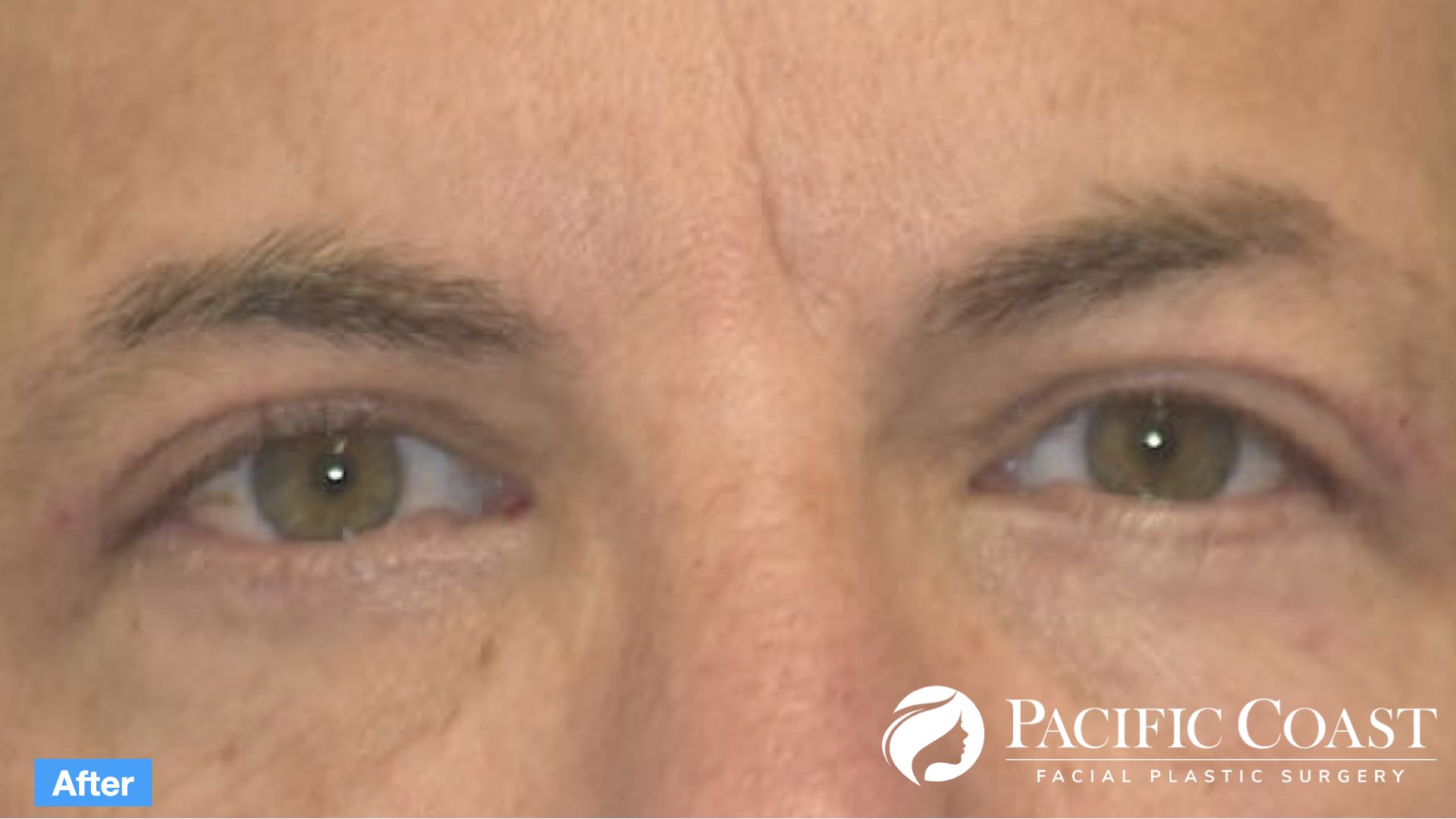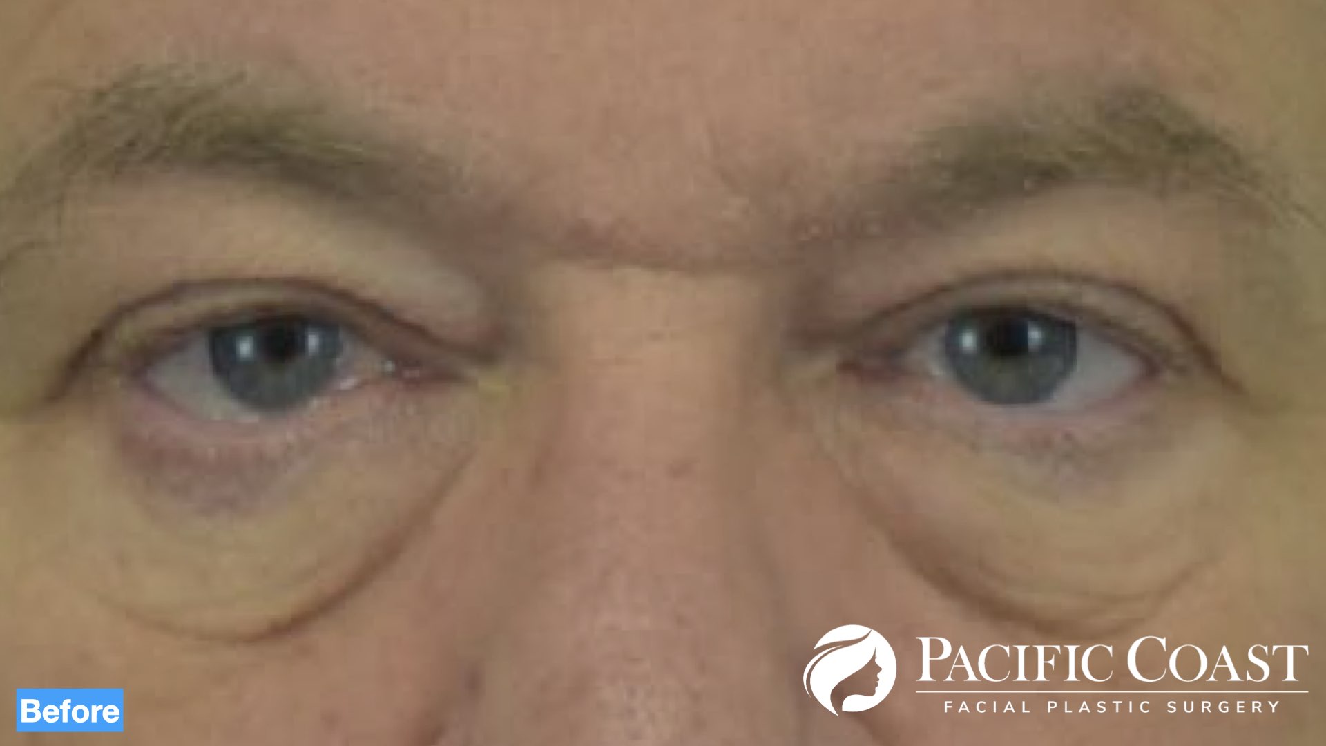 56 year old male 1 year post op lower eyelid blepharoplasty with fat repositioning (removal of lower eye bags). Patient reported unhappiness with tired appearance, dark under eye circles, and puffy lower eyelids.