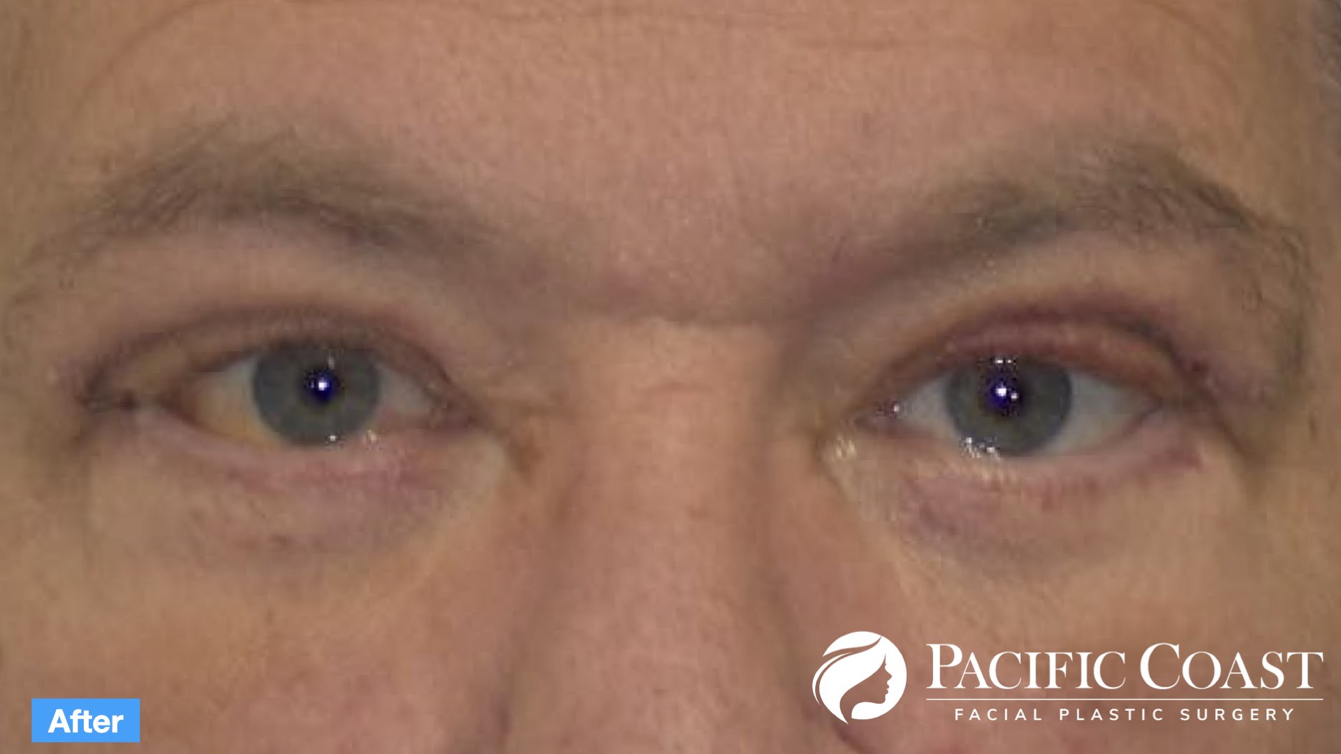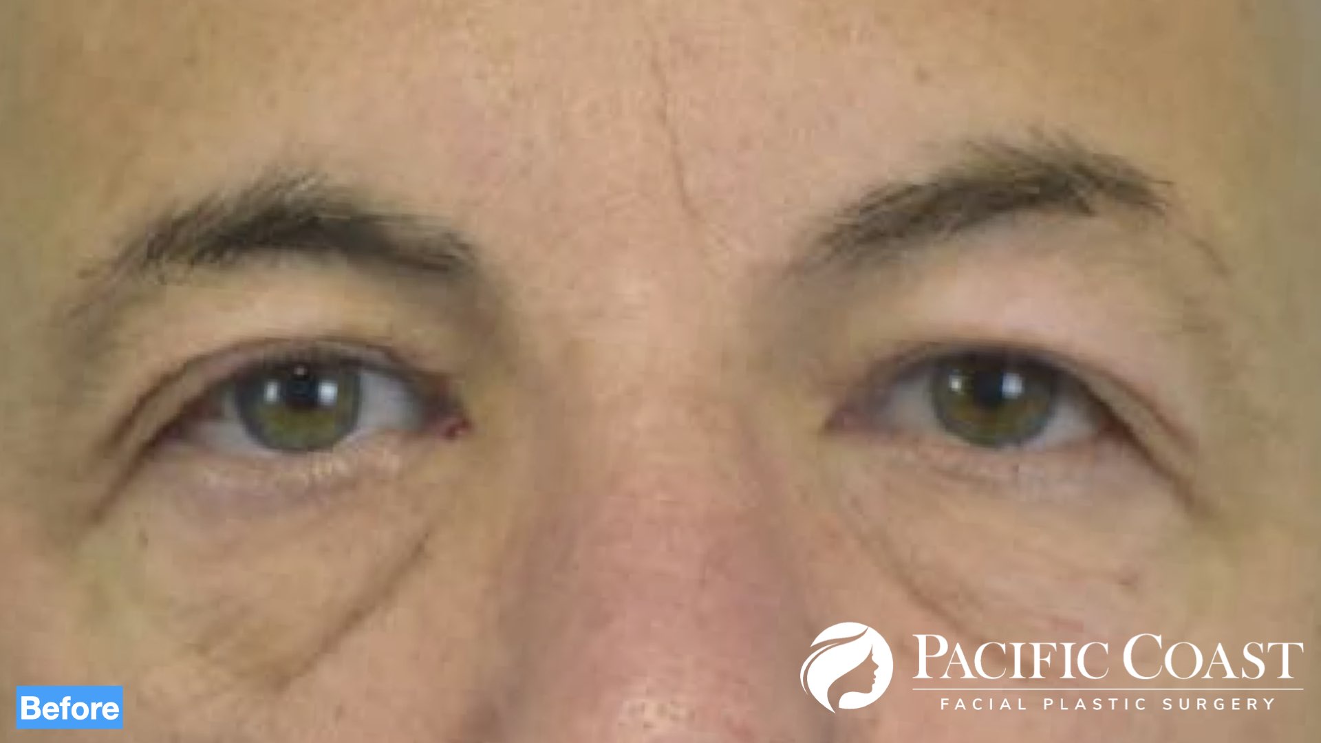 56 year old male 1 year post op lower eyelid blepharoplasty with fat repositioning (removal of lower eye bags). Patient reported unhappiness with tired appearance, dark under eye circles, and puffy lower eyelids.
